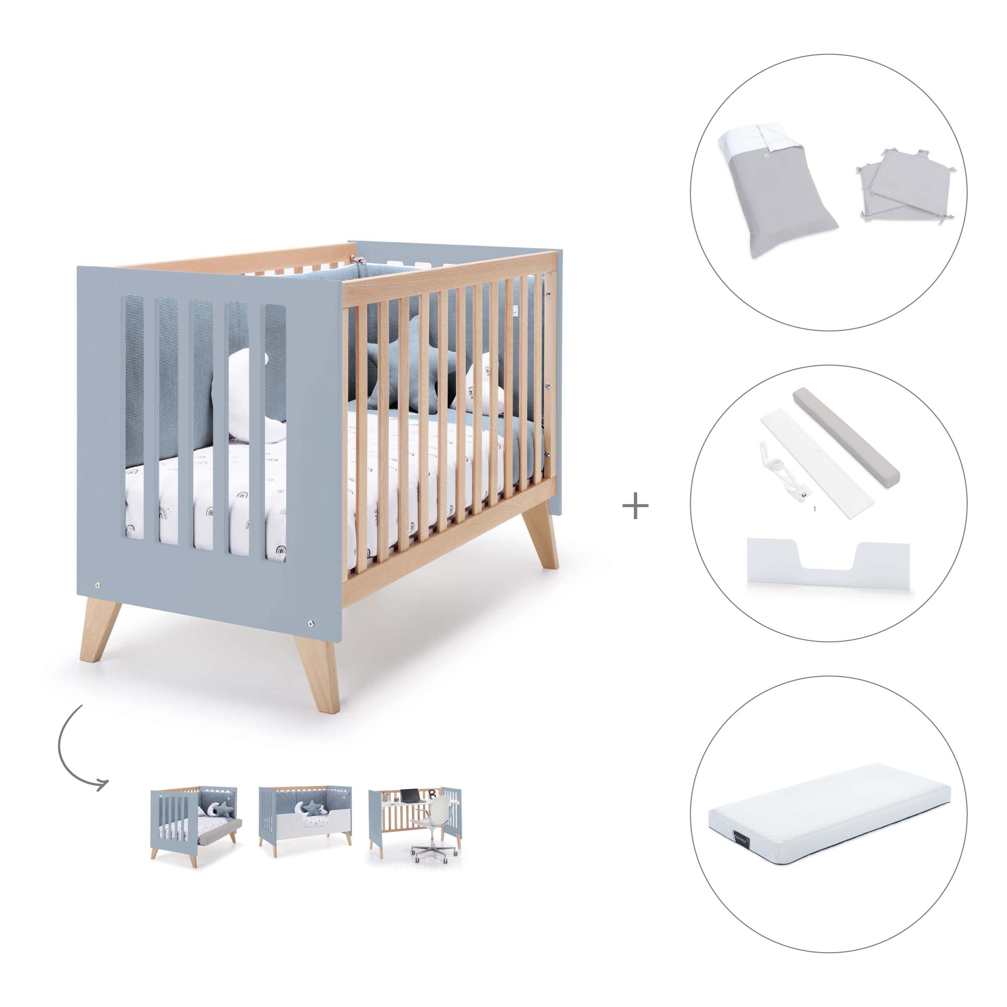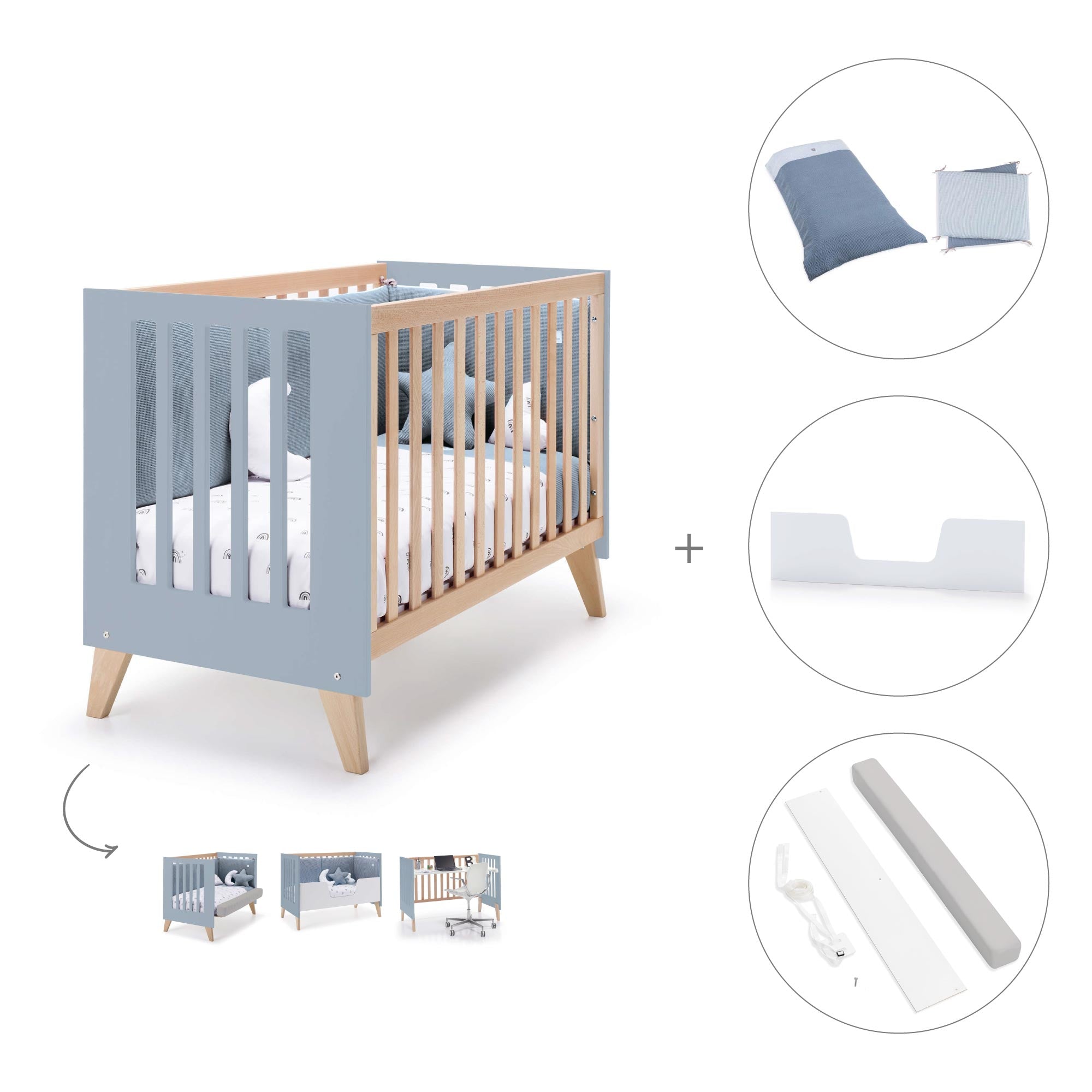• Convertible in 5 stages without additional elements: Co-sleeping crib - Crib - Kids' sofa - Desk - Toy box.