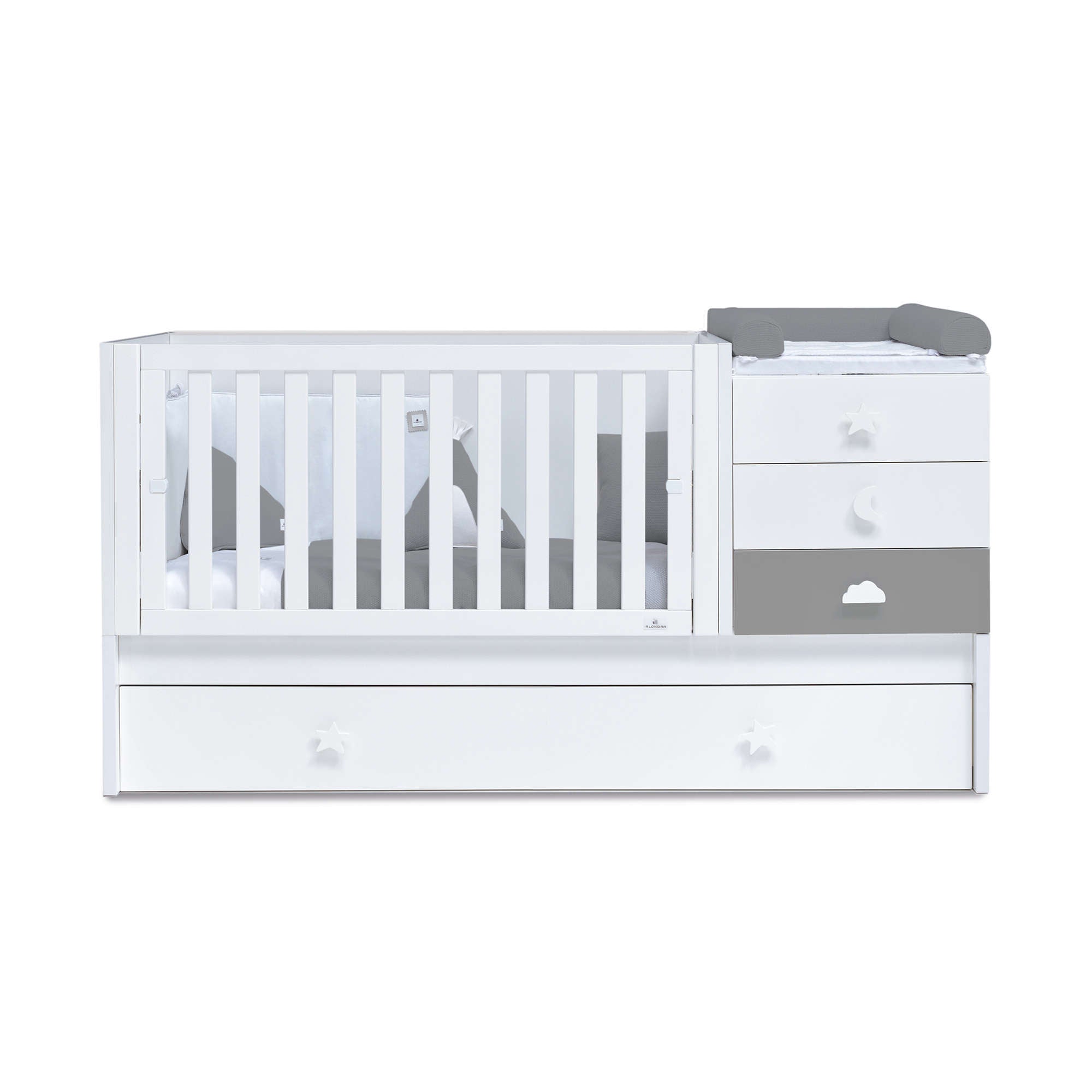 • Reversible convertible crib (can be assembled with the drawer unit on the left or on the right).