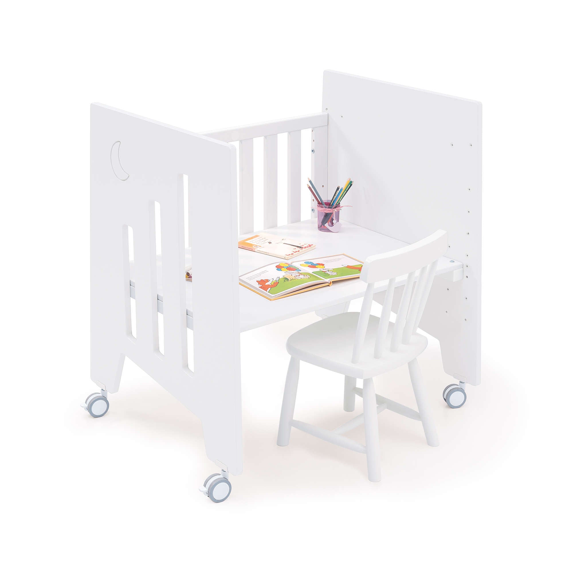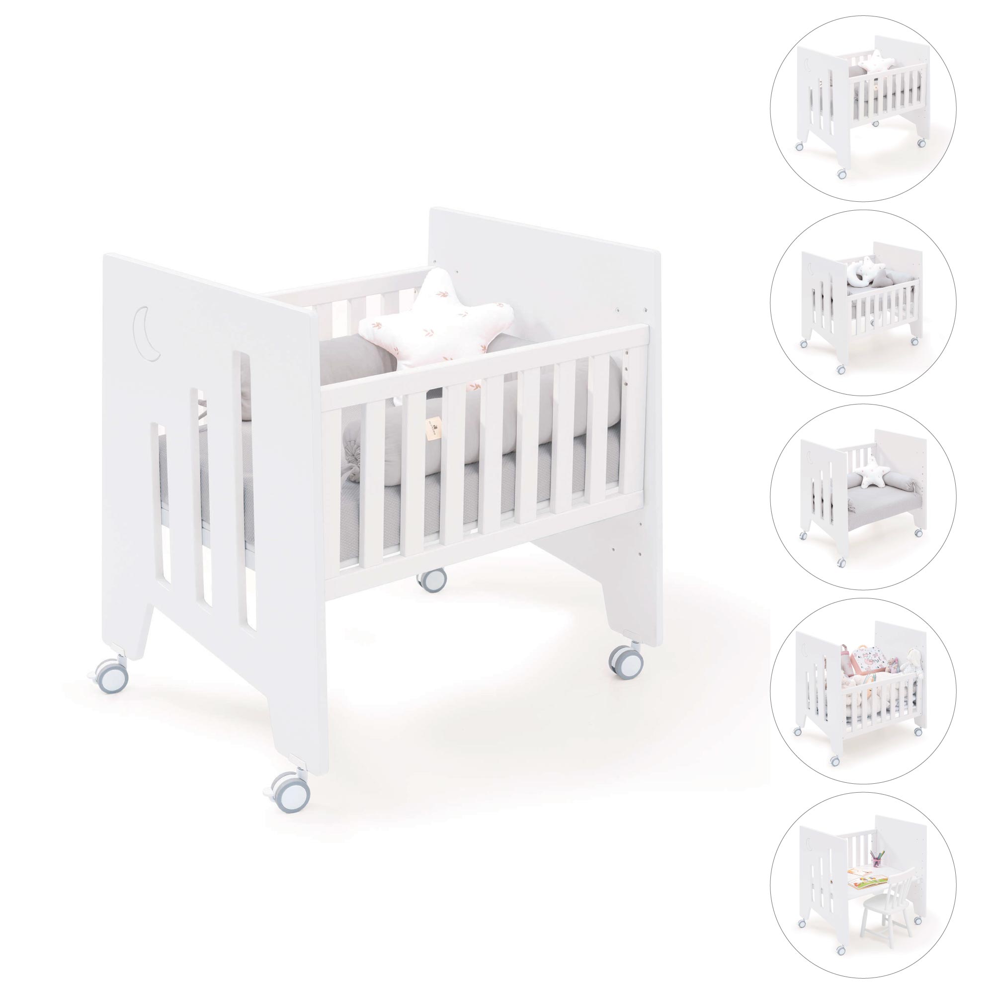 • Convertible en 5 étapes sans éléments supplémentaires : Berceau cododo - Berceau - Canapé pour enfant - Bureau - Coffre à jouets.