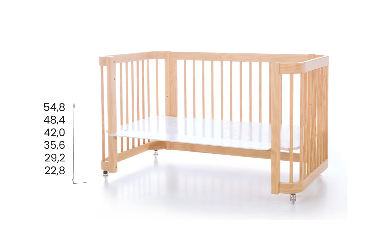 Le sommier à lattes du lit bébé peut être réglé à 6 hauteurs différentes, pour qu'il soit au même niveau que le lit double (même s'il peut être quelques centimètres plus bas, sans aucun risque) . De plus, si avec ces hauteurs de sommier le lit bébé n'est toujours pas à la hauteur du lit, les roulettes peuvent être retirées. De cette façon, vous aurez le choix entre 5 hauteurs supplémentaires.