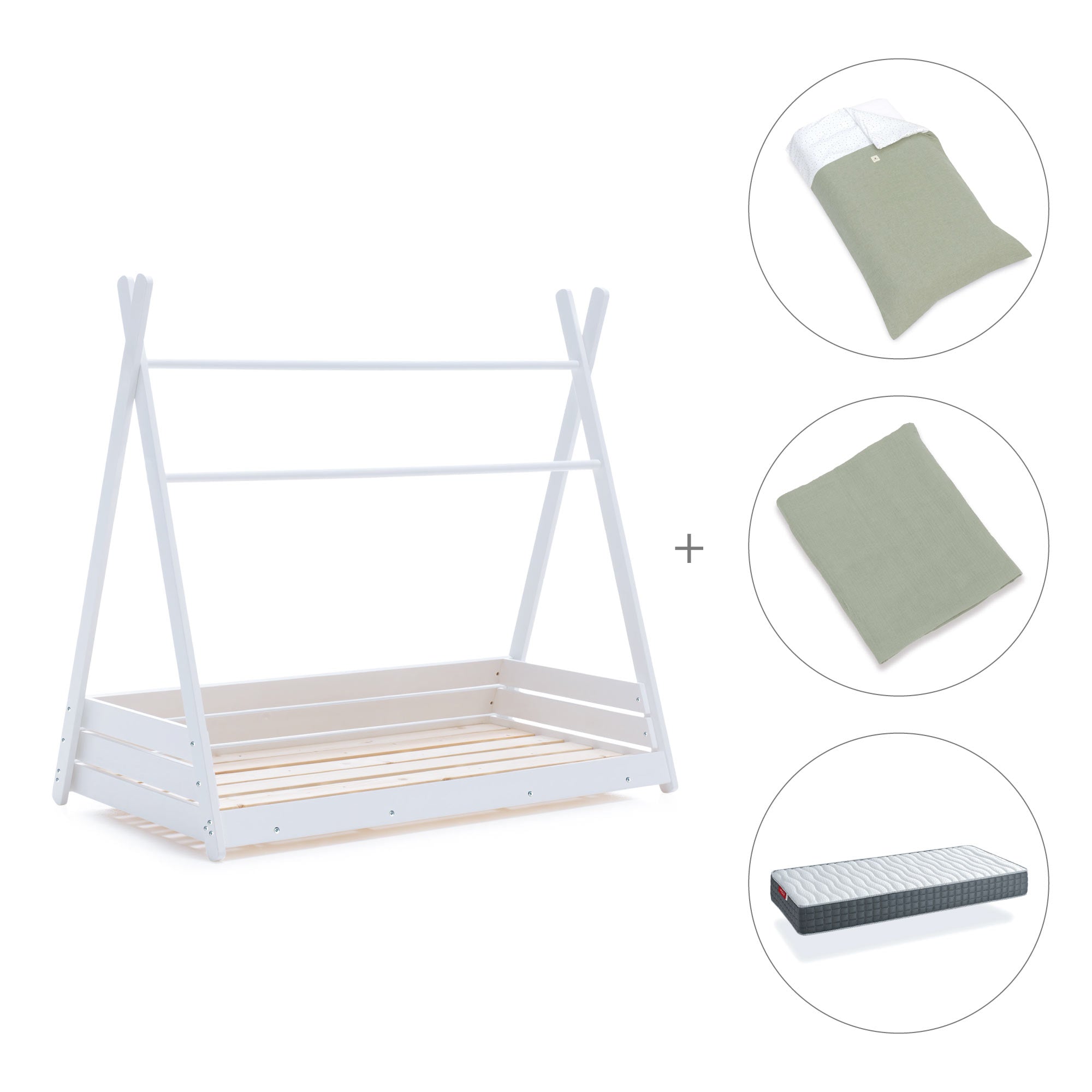 Lit Montessori blanc 90x200 cm avec linge de lit vert · Homy XL