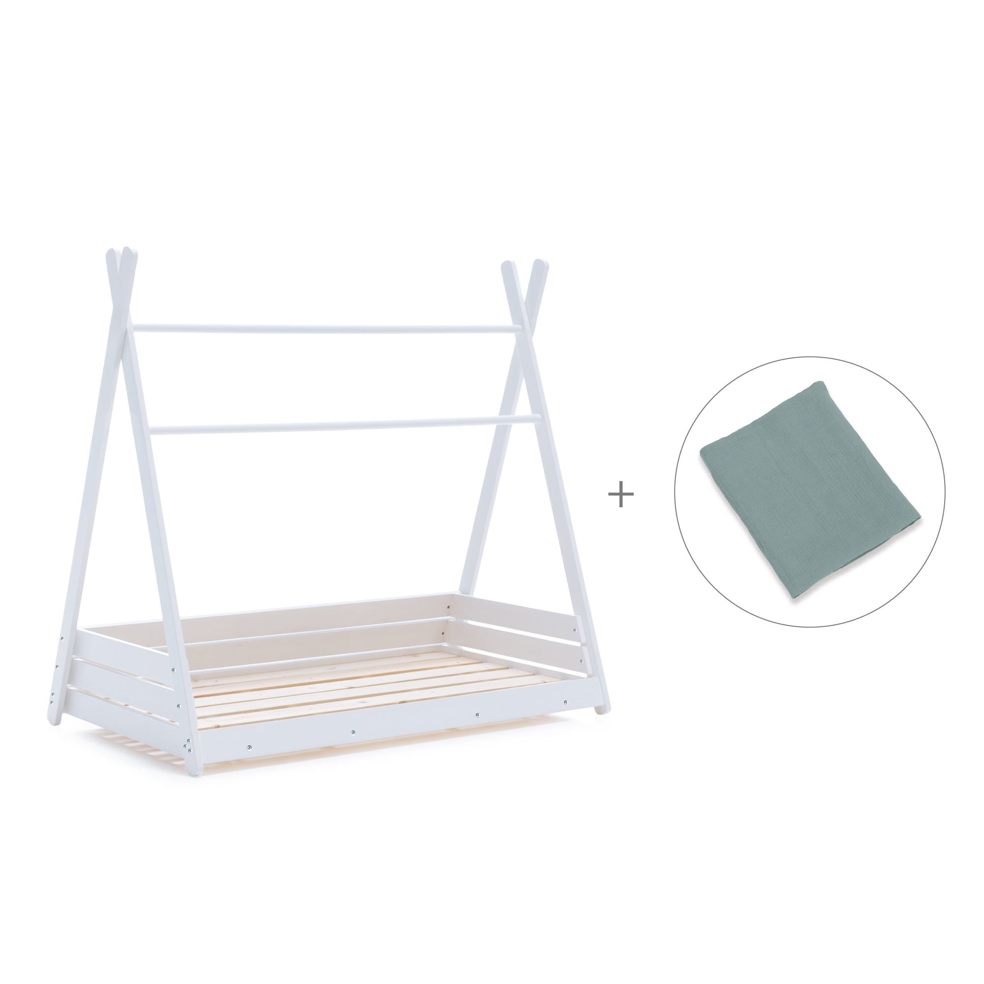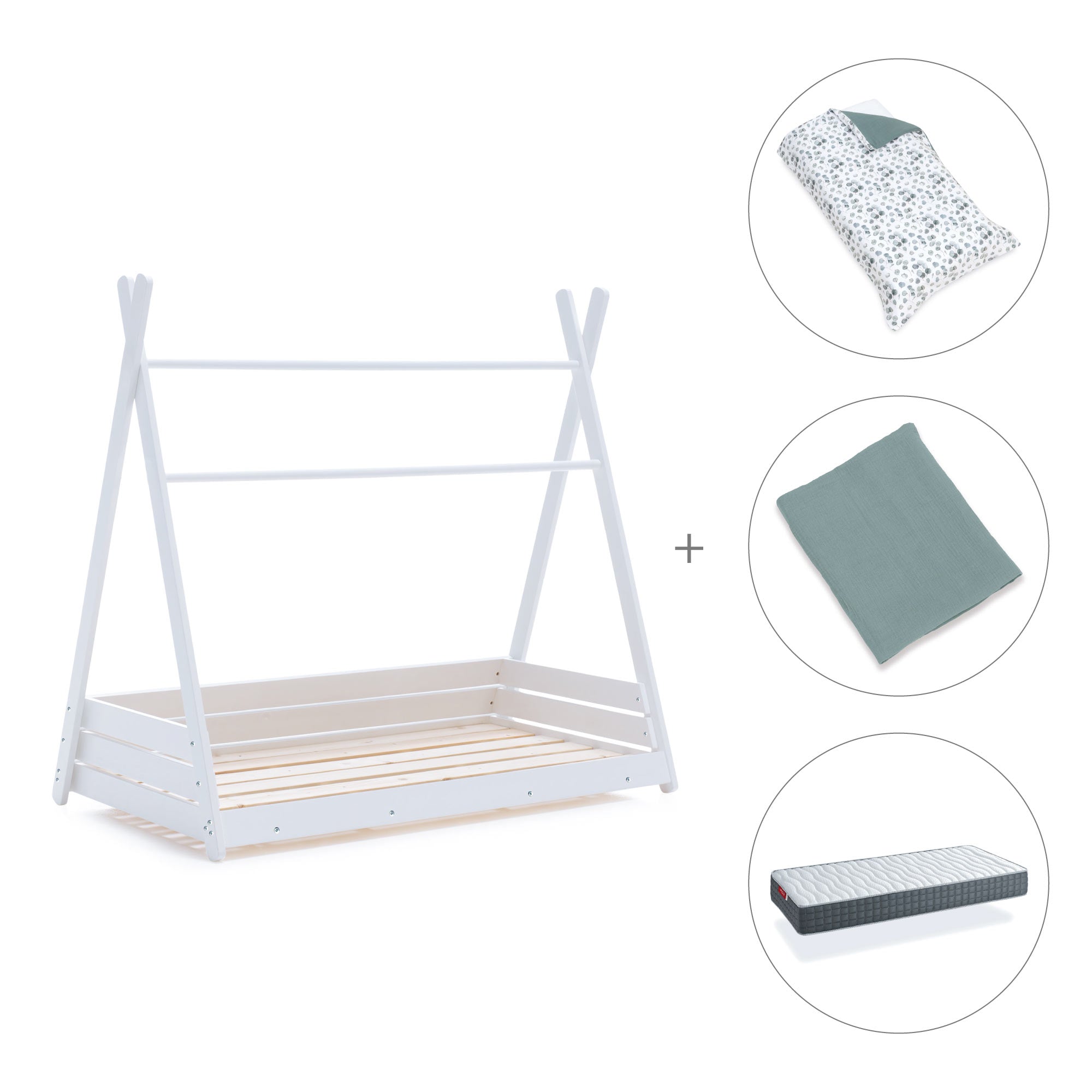 Lit Montessori blanc 90x200 cm avec linge de lit vert eucalyptus · Homy XL