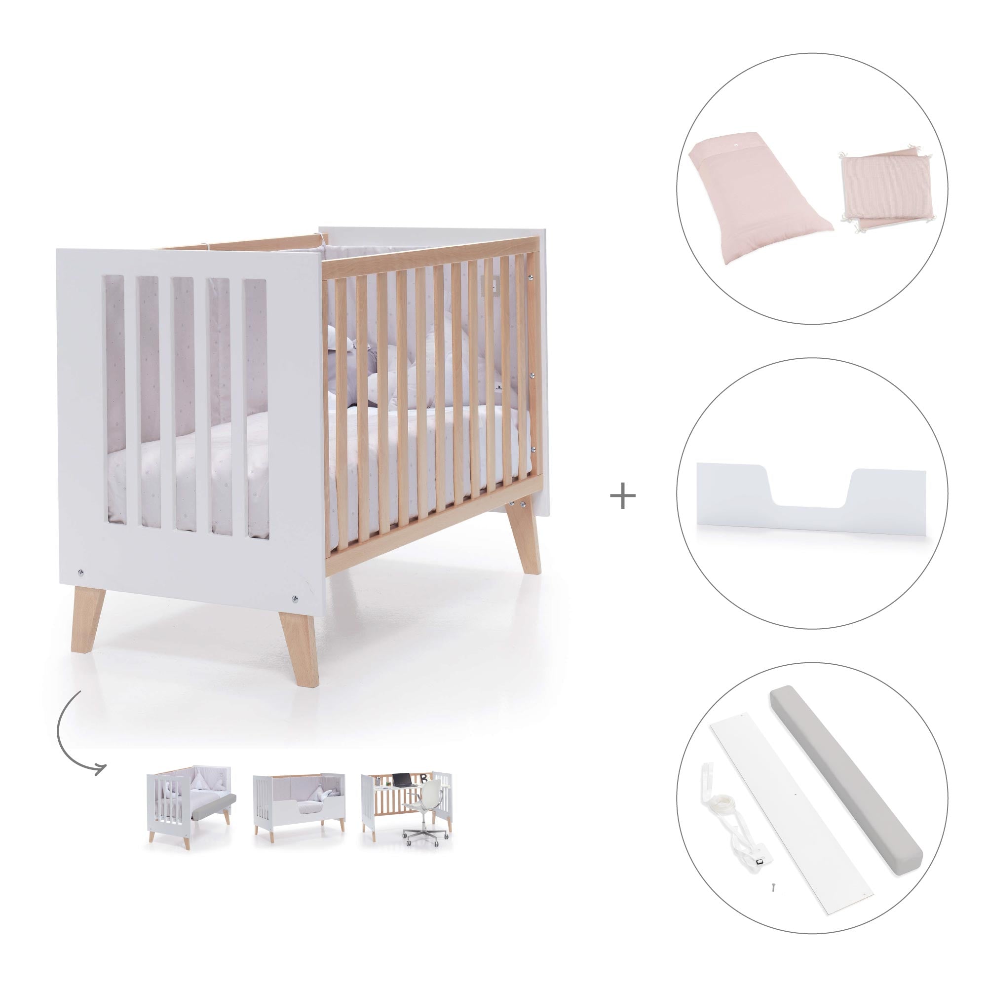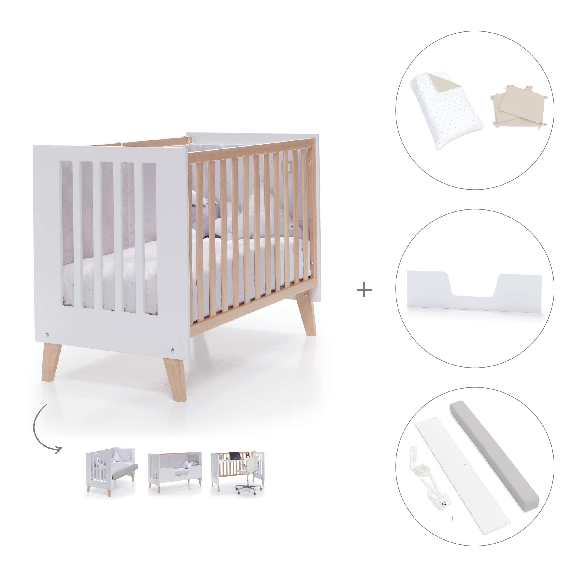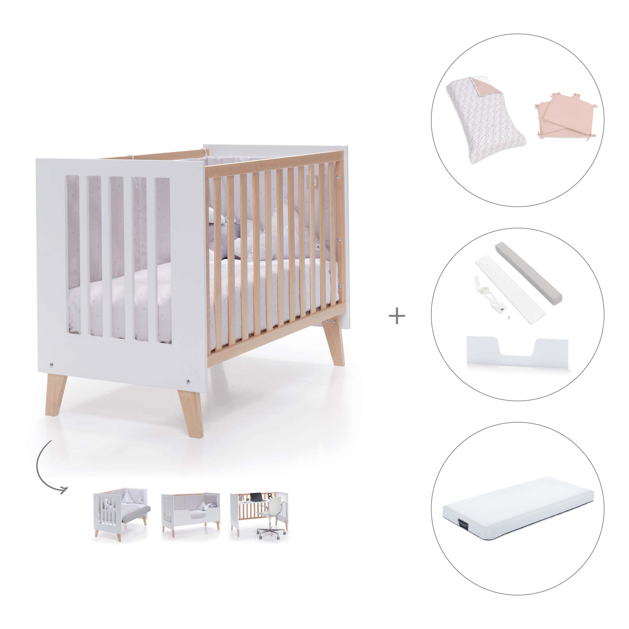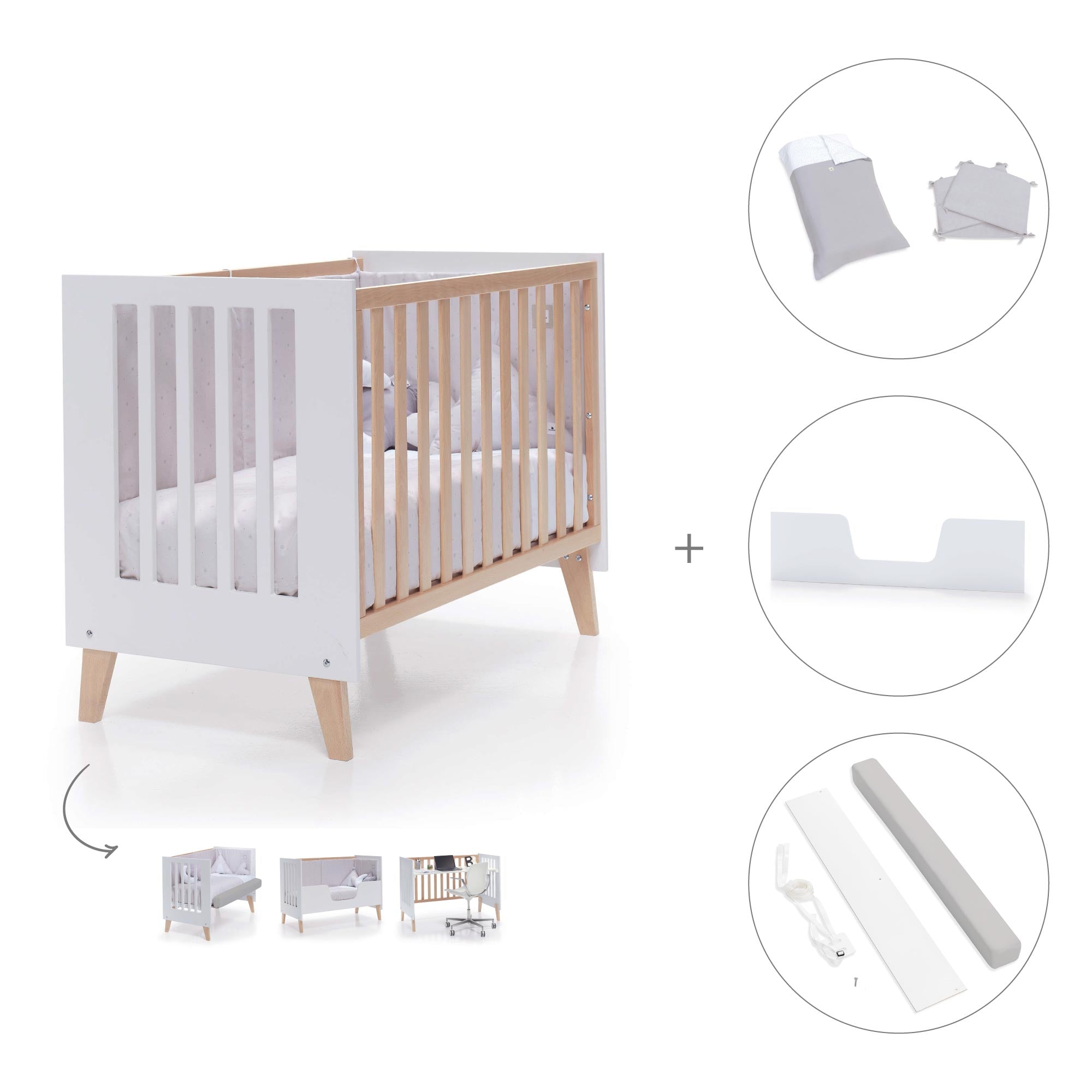 We introduce you the wooden co-sleeping cot NEXOR with Nordic style by Alondra. With this cot you can create a space full of magic and sweetness thanks to its white colour and the warmth given off by its design in wood. You can transform it into 4 different stages using the available accesories for it. You can use it as a conventional cot, co-sleeping cot attached to the bed, toddler bed or desk. In addition, you can outfit it with the textile sets that you like the most. It will be wonderful!