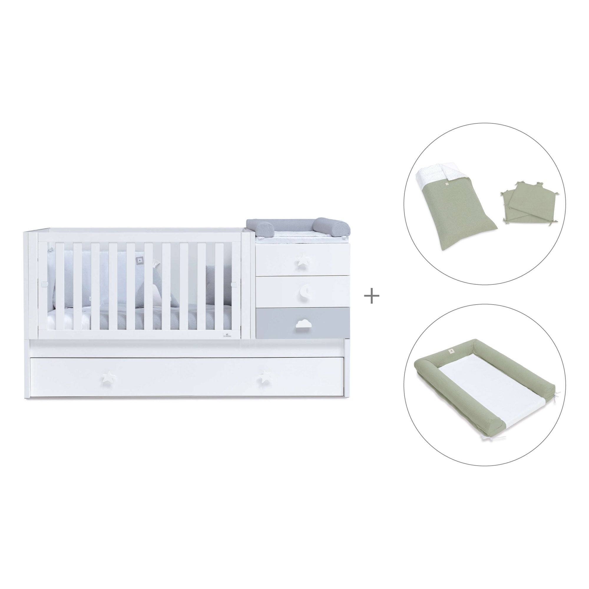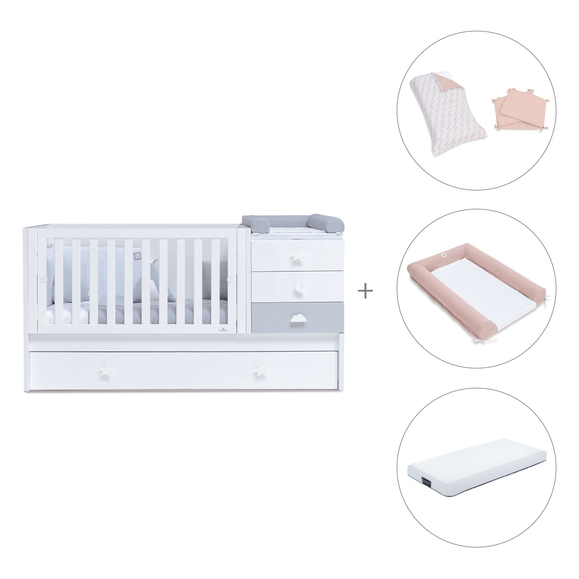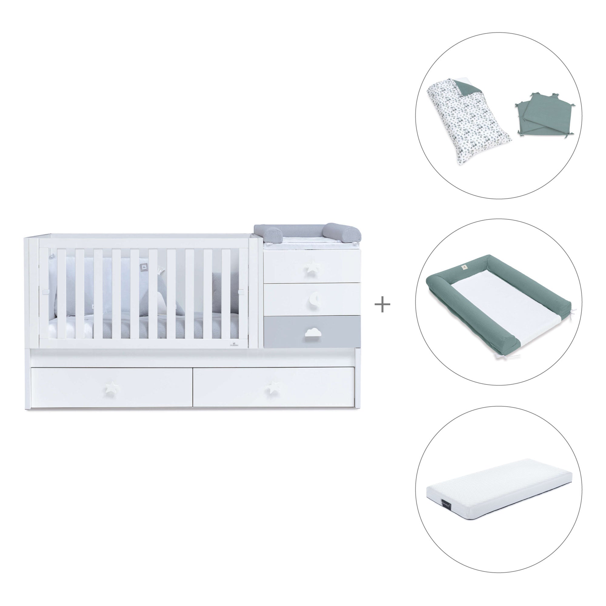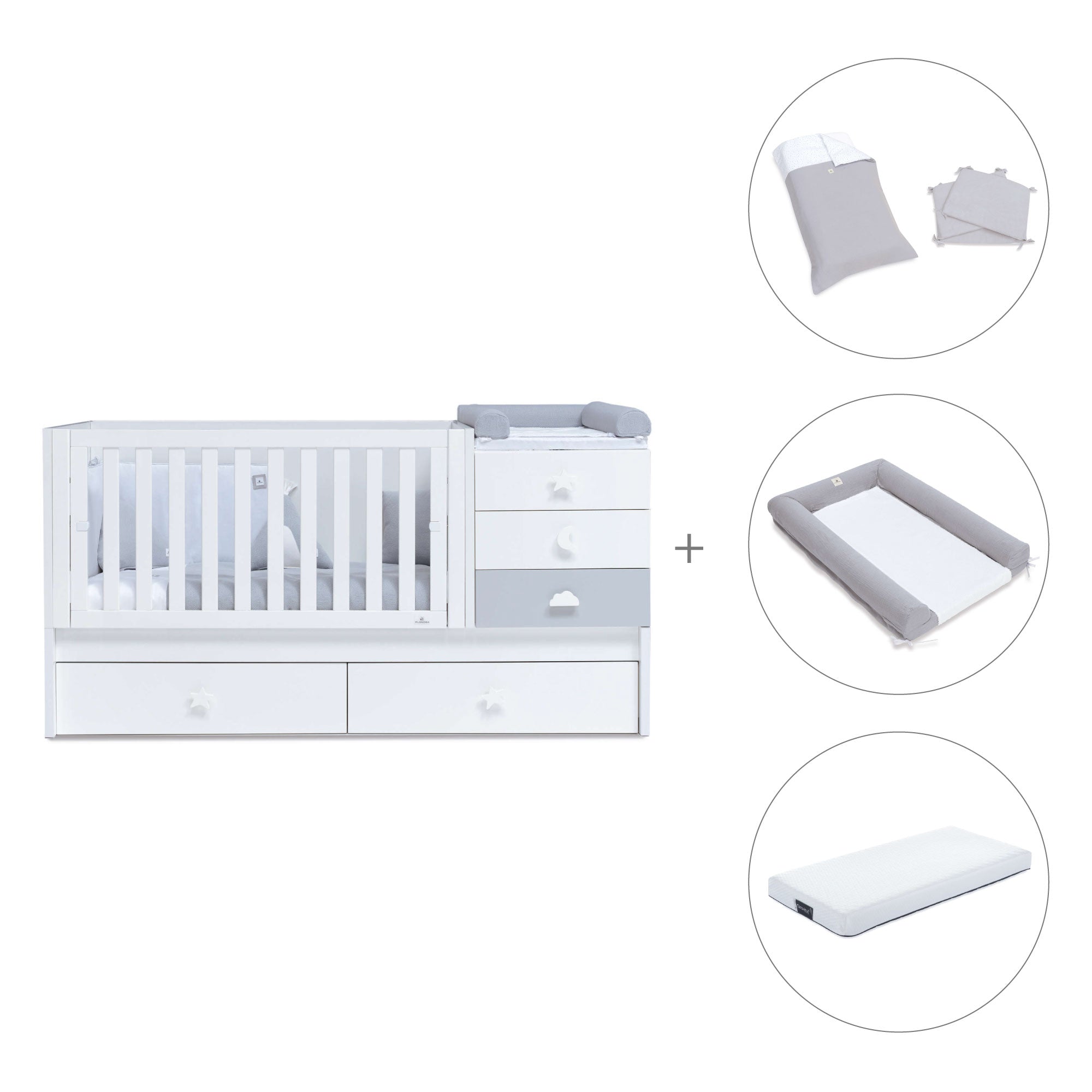 Don't miss the convertible crib Sero Bubble Grey, for your little one to have their own convertible nursery. It has the drawers handles in different funny shapes and the combination of white and matt grey colours. You can create a lovely room that will be super easy to combine and decorate! As a convertible crib, it will be adapting to your baby's different needs. Chose your favourite textile set and desing a super cosy atmosphere for your baby!