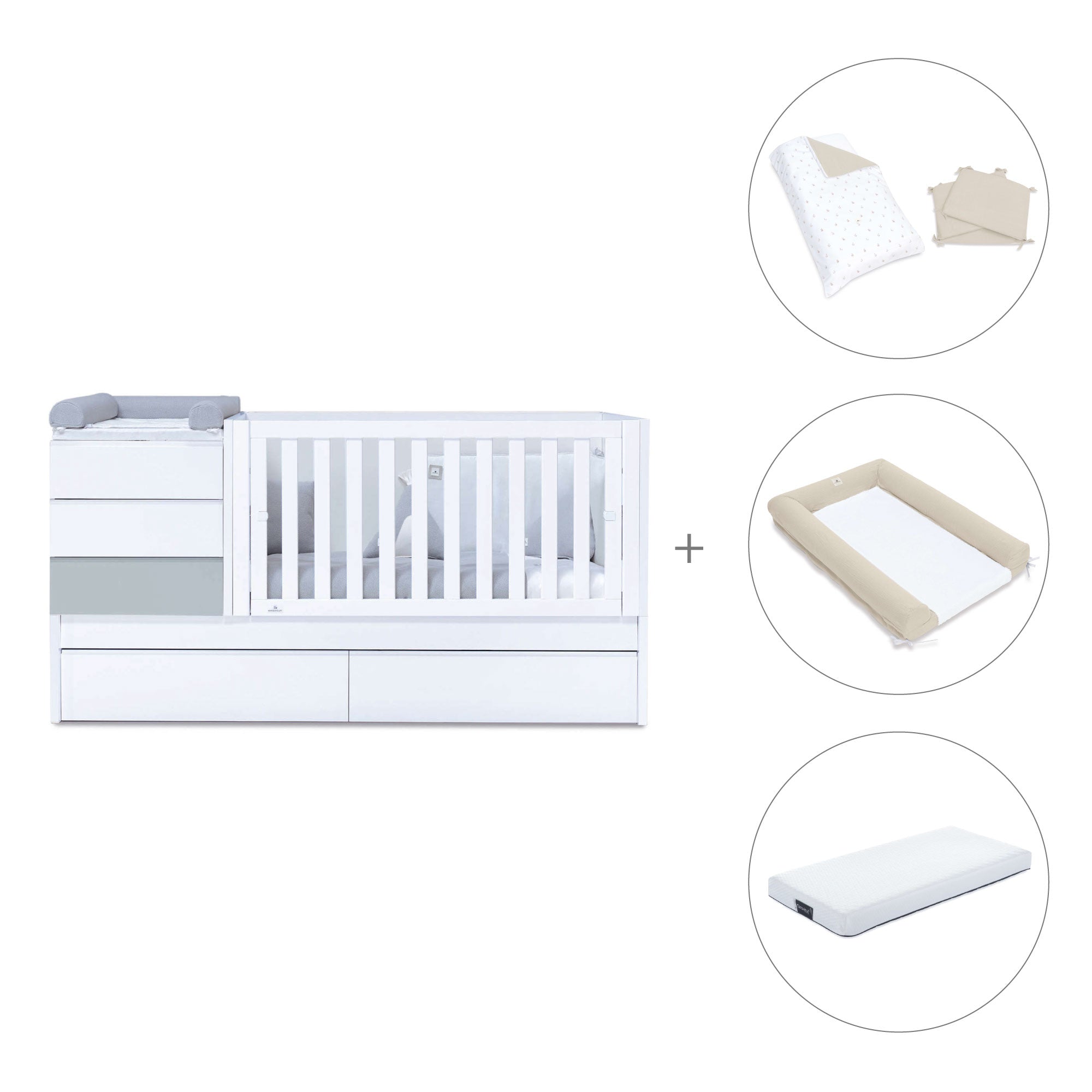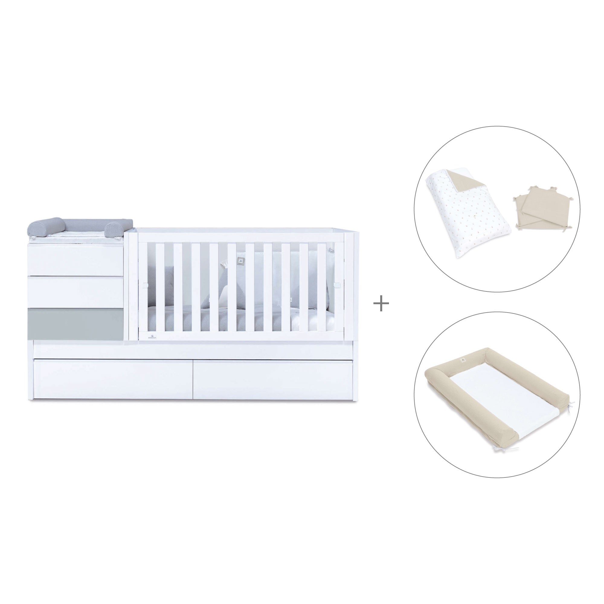 Don't miss the details of this convertible crib with trundle bed or storage drawers Sero Kubo Grey and create a neutral space full of magic. One of the simplest convertible cribs in our collection, it matches the elegance of matt white with the personality of neutral tones. Like all our convertible cribs, the Sero Kubo Grey evolves at the pace of your little one and adapts to their needs. Furthermore, you can choose from all the different colours and textile packs available to suit the style you are looking for.
