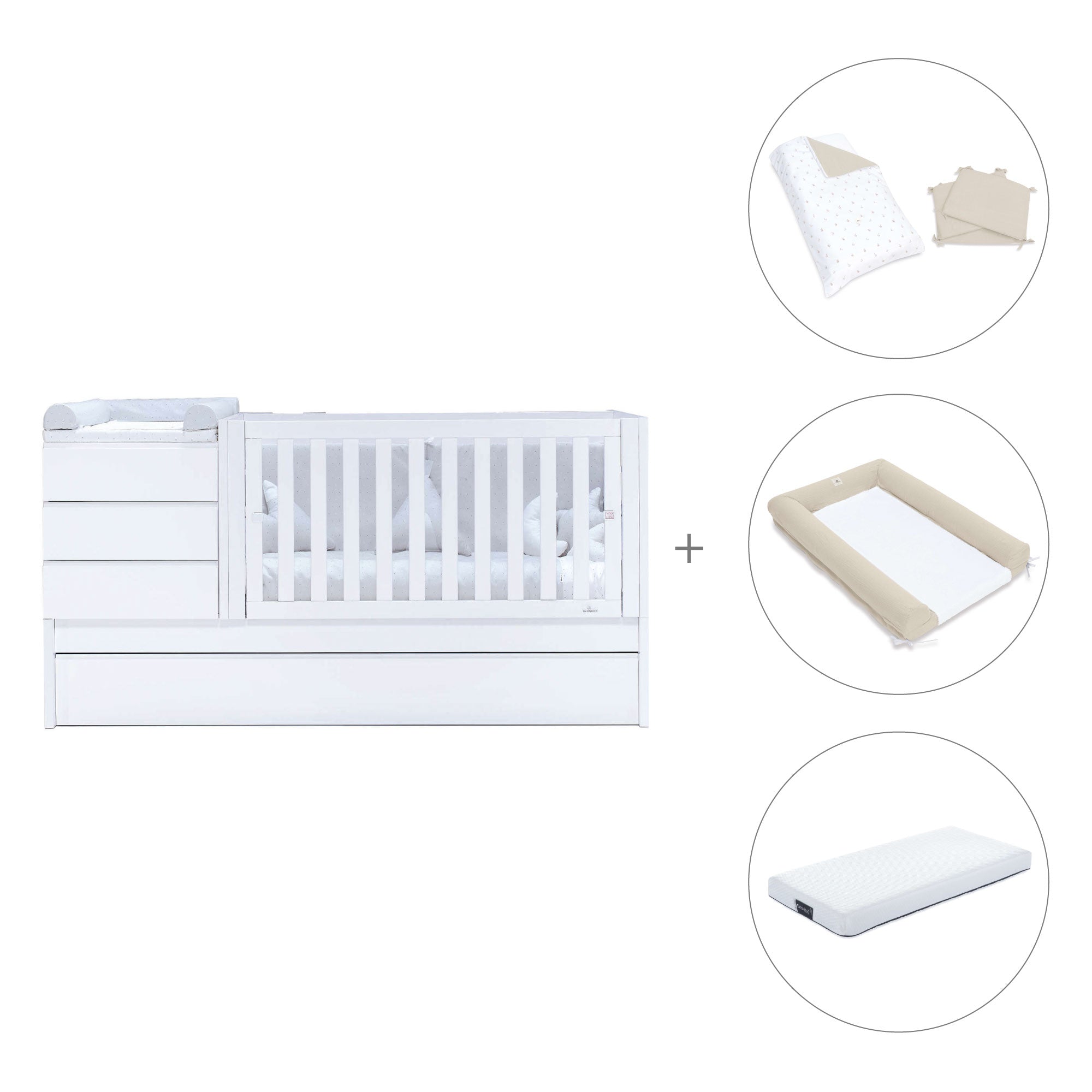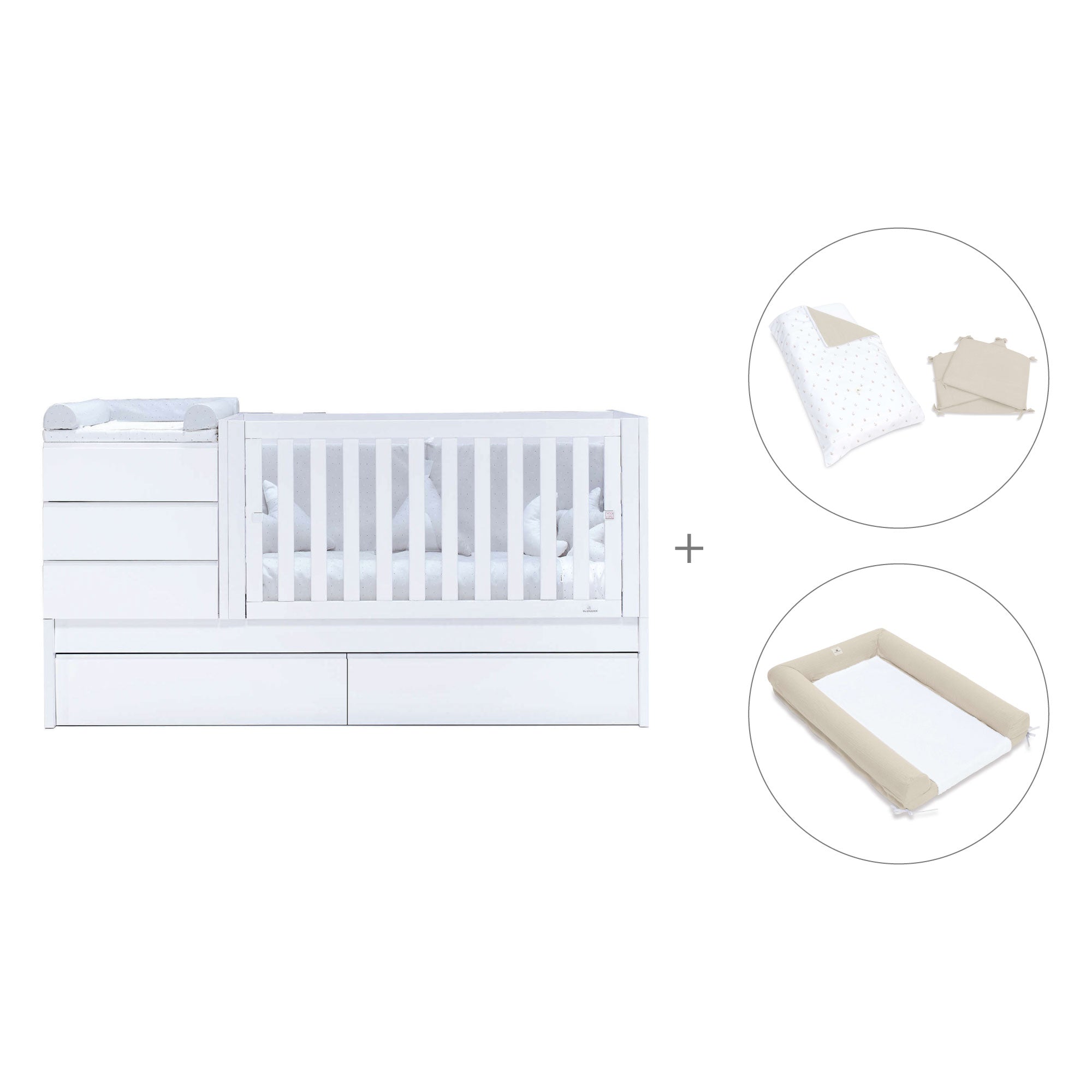 Don't miss the details of this convertible crib into bed Sero Kubo with simple lines. With a timeless style, it has a wood-textured bottom and the rest of the elements lacquered in matt. Like all our convertible cribs, it adapts to the different stages of baby's growth and it's available in different combinations and textile packs, so you can choose the one you like best.
