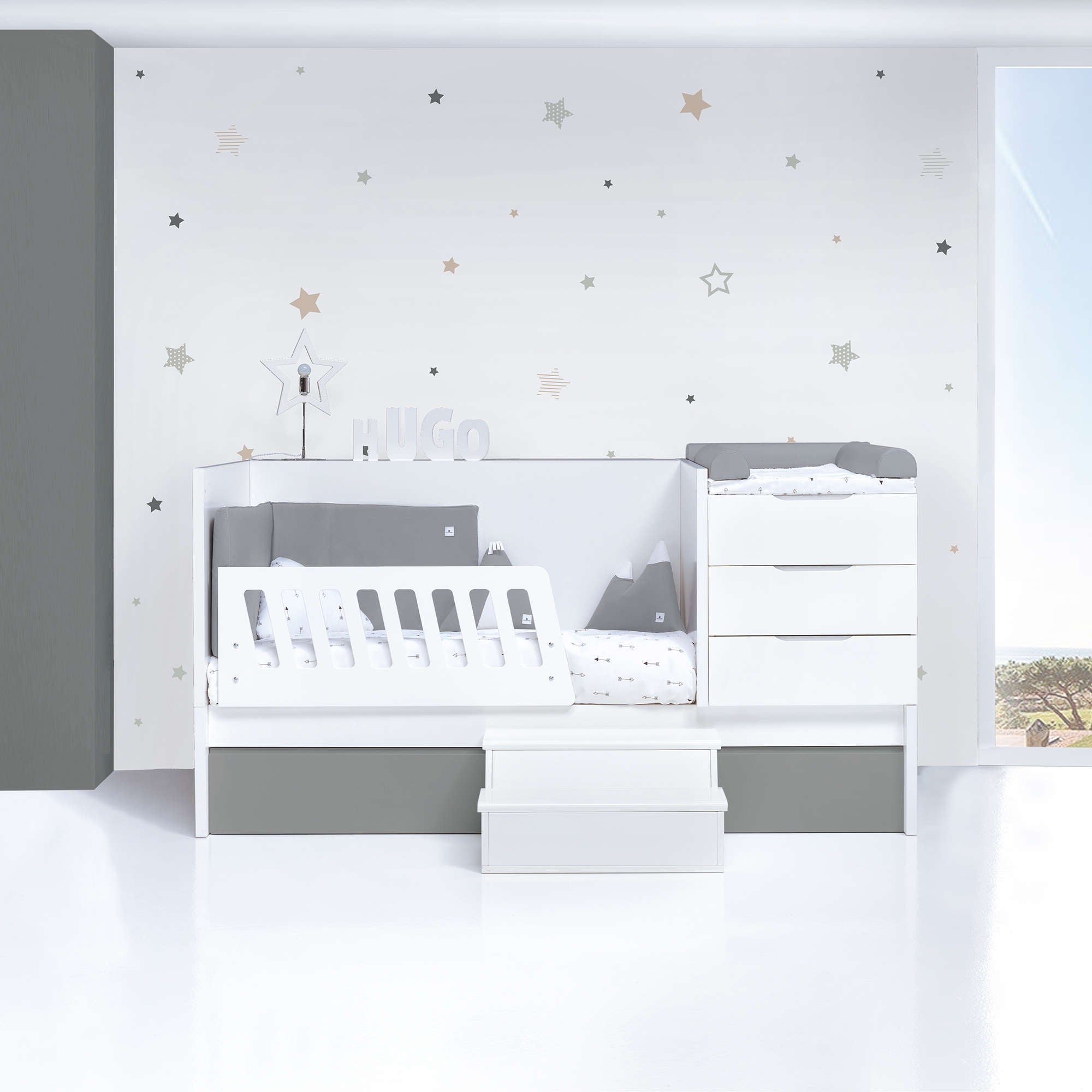 In the same piece of furniture you will have the 70x140cm crib, a table with 3 drawers and changing area at the top, a book shelf on the side with two large capacity spaces and, at the bottom, 3 drawers or a trundle bed (to choose).