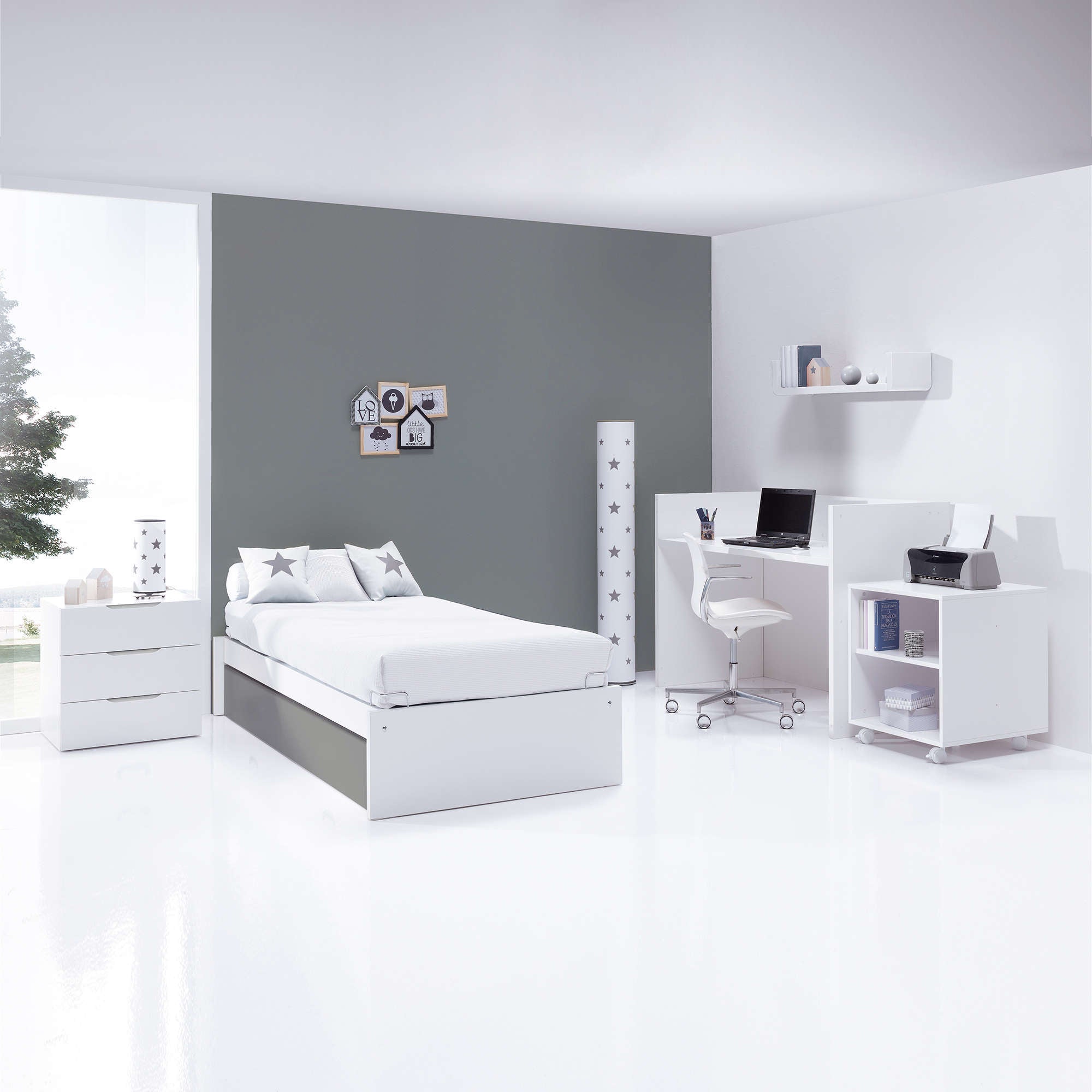 The convertible can be disassembled and transformed into 4 different pieces of furniture for the youth room : a 90x200 cm bed, a small table with 3 drawers, a book shelf and a desk.