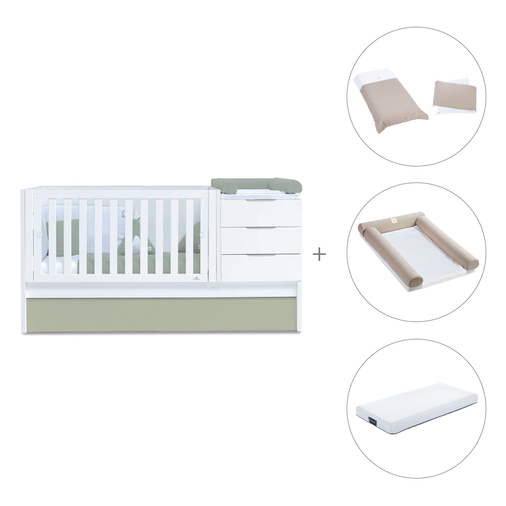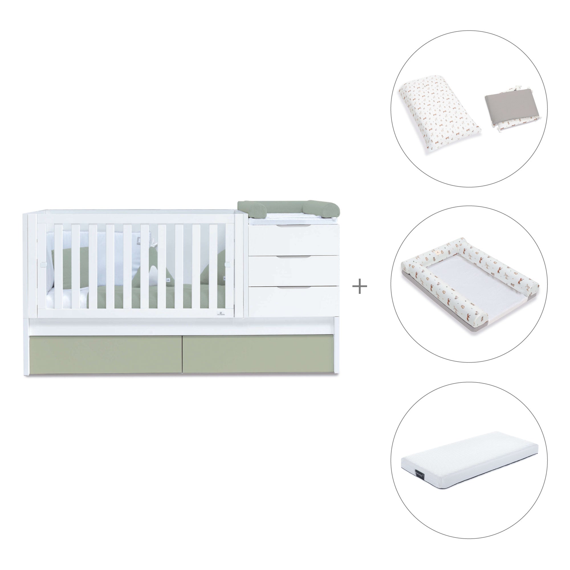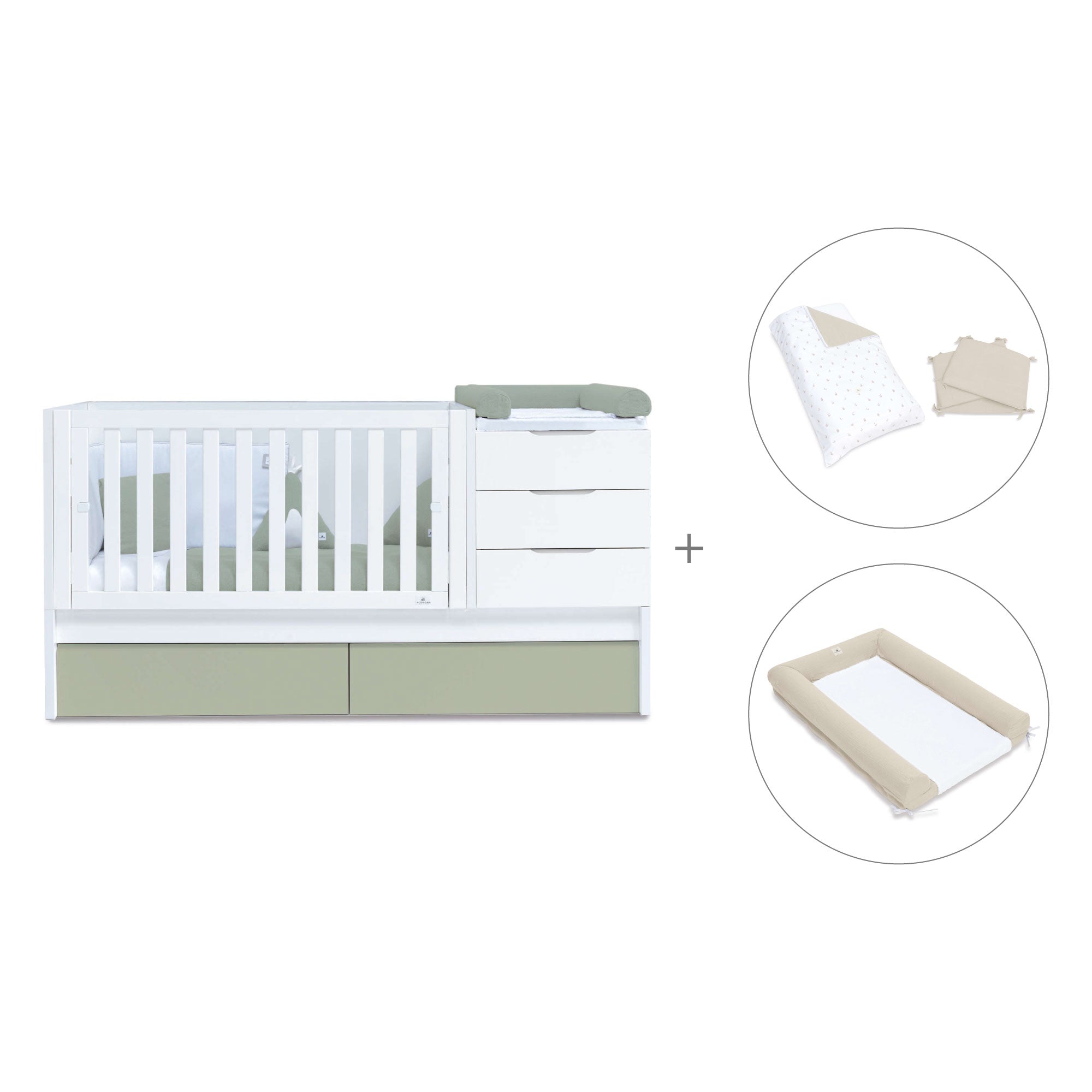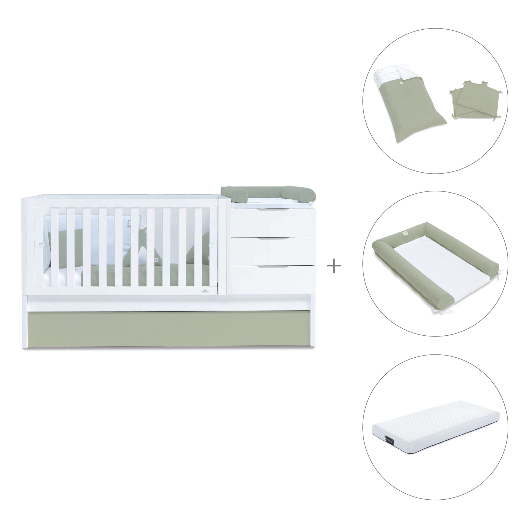 Fall in love with the happiness of the baby crib convertible into bed and desk Sero More Erba, the aqua green shades are trendy and also convey the naturalness and calm of the sea. Perfect for a convertible baby bedroom! Being an evolving crib, it will become a complete convertible nursery when your baby grows up. You can match the cots-beds for babies and choose the textile pack you like the most.