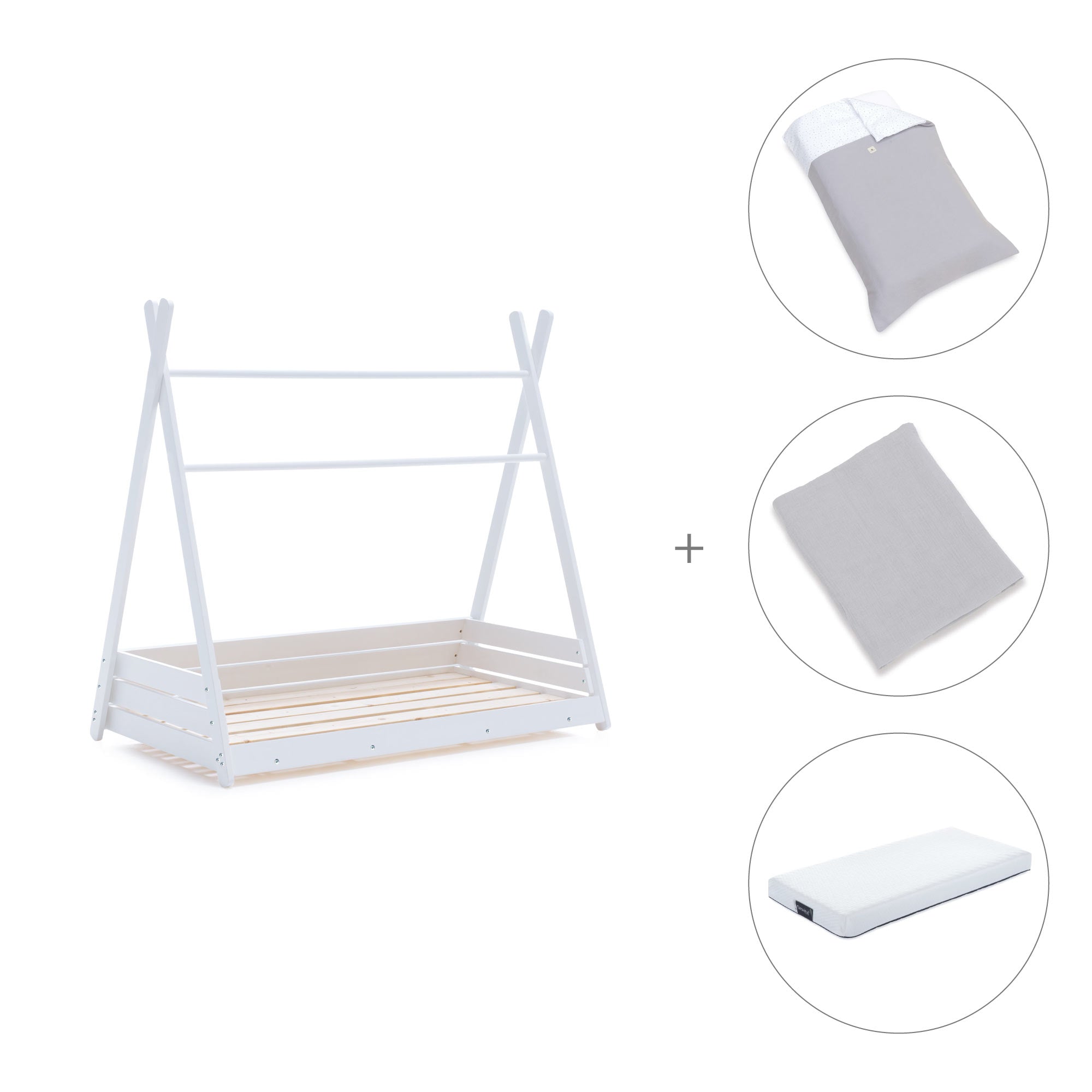 Withe Montessori bed 70x140 cm with grey bedding · Homy