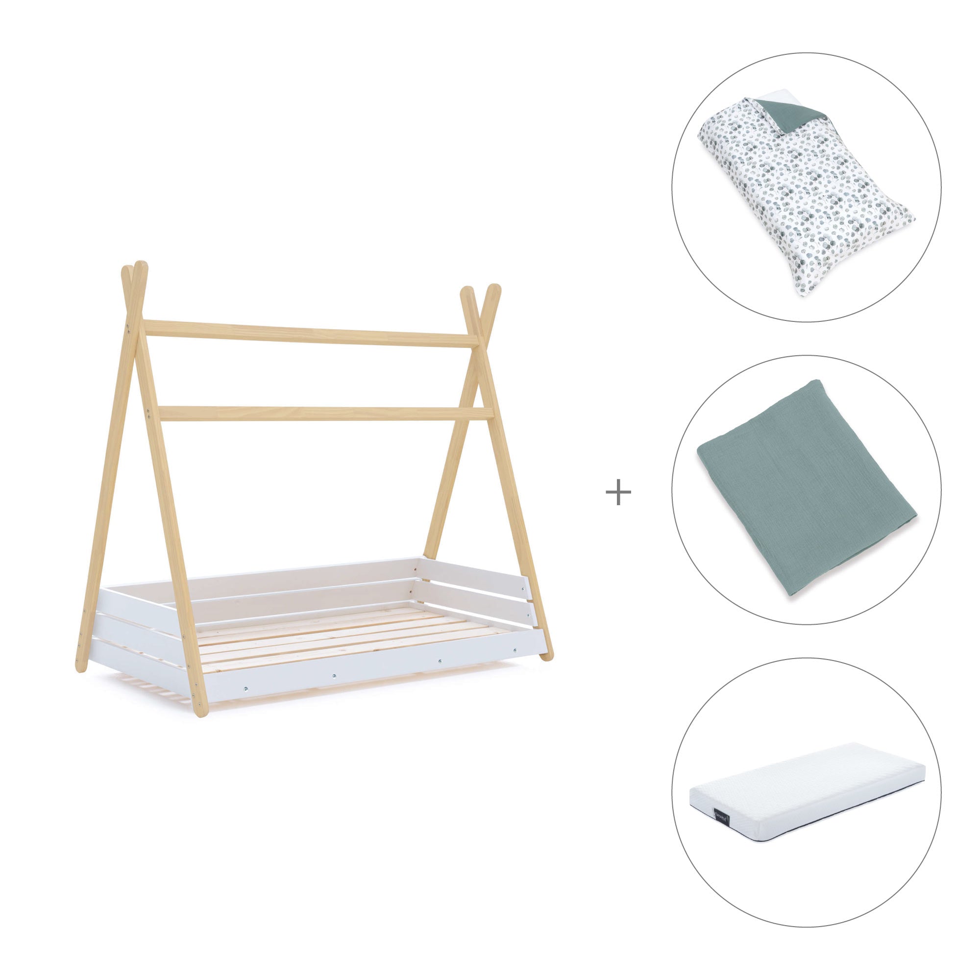 Wooden Montessori bed 70x140 cm with green bedding · Homy Life
