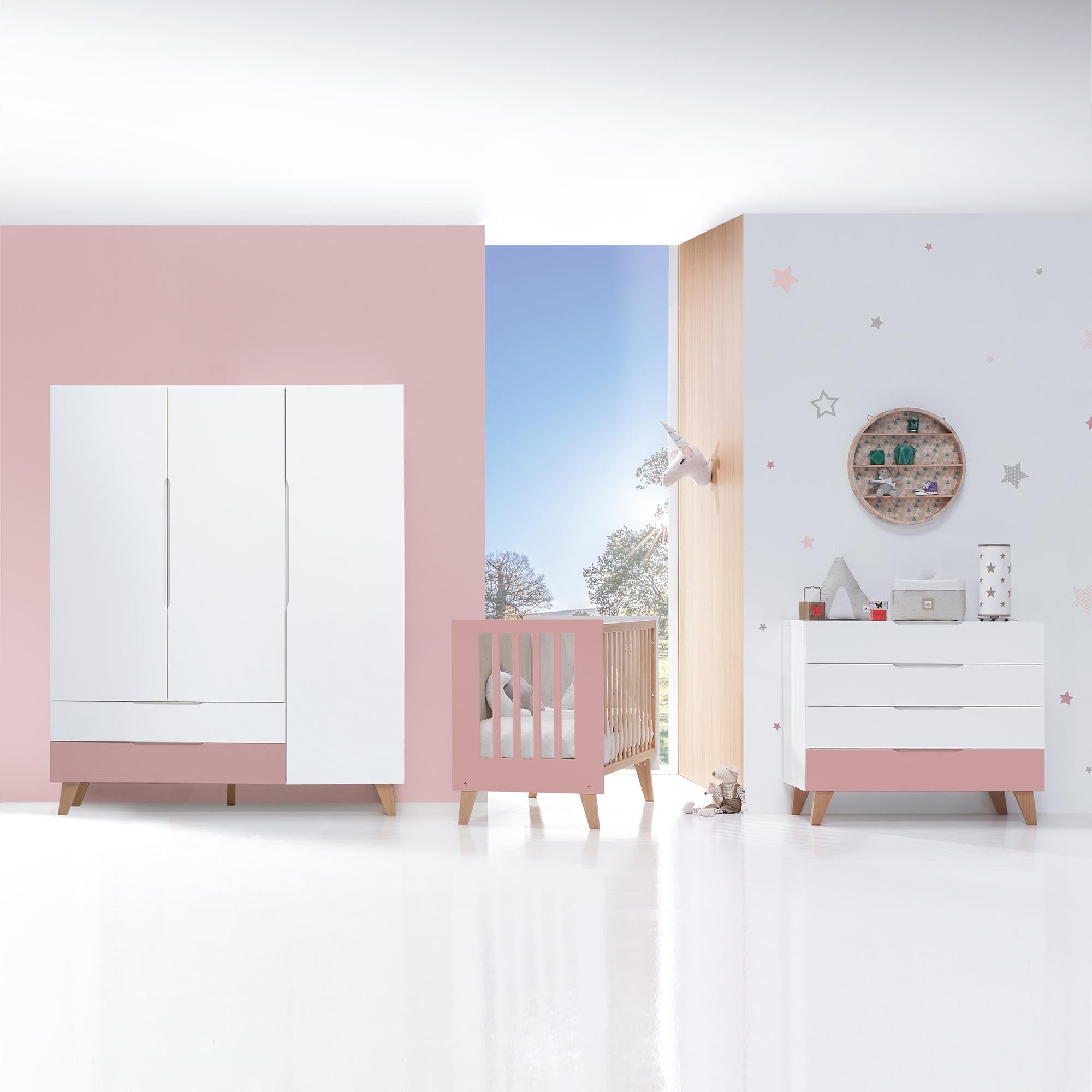 Si lo que buscas es diseñar una habitación de bebé acogedora y con mucho espacio, entonces te va a encantar esta habitación infantil en color blanco, madera y cuarzo rosa. Compuesta por una cuna de 60x120 cm, un armario grande con 3 puertas) y una cómoda (con 4 cajones). Una combinación perfecta para crear un espacio completamente equipado, combinando estilo y comodidad.