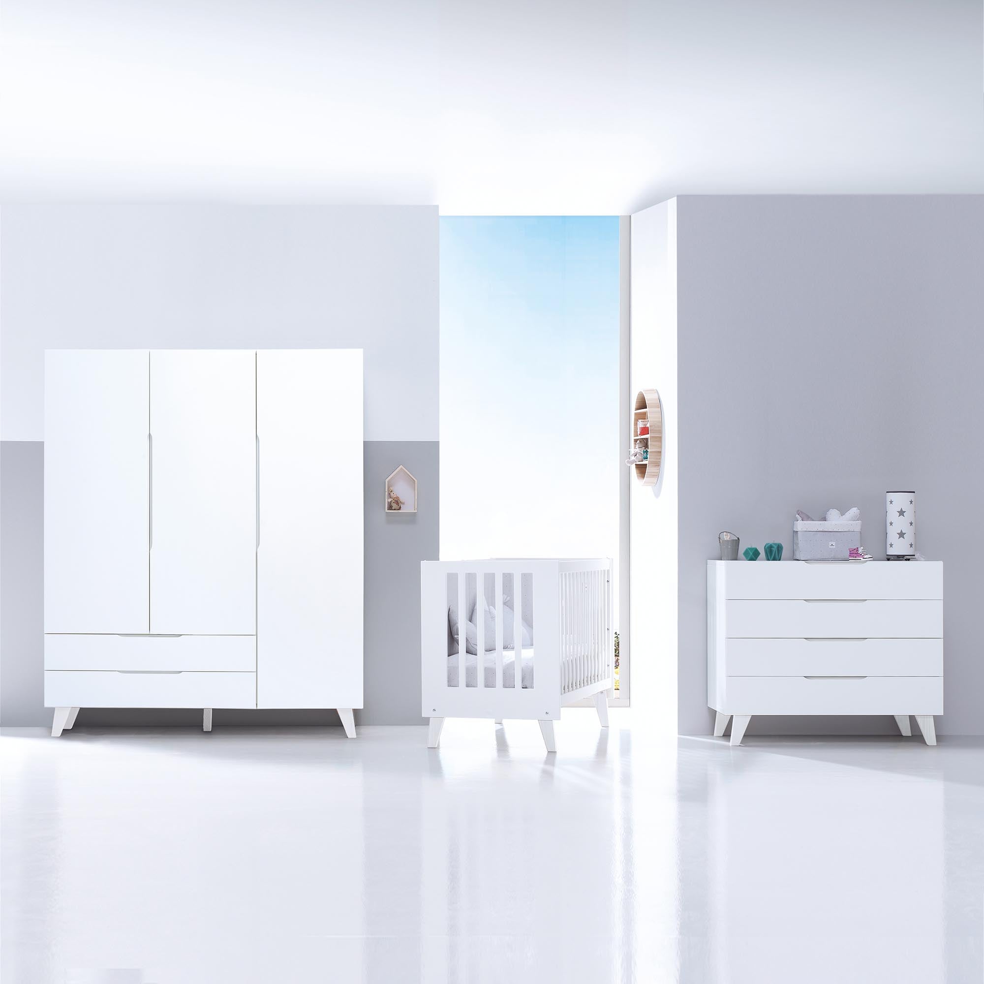 Enamórate de cada detalle de este dormitorio infantil en color blanco que incluye una cuna de bebé de 60x120 cm, un armario grande (3 puertas/2 cajones) y una cómoda (4 cajones). Un conjunto de muebles infantiles perfectos para amueblar el espacio perfecto para tu bebé, completamente equipado, combinando estilo, comodidad y atemporalidad. Tanto para habitaciones infantiles de niña como para dormitorios infantiles de niño.